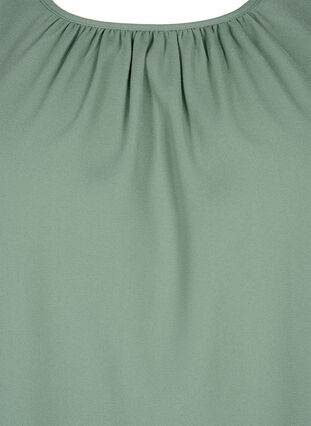 Puseron hihoissa on kauniita virkattuja yksityiskohtia. Puseron pyöreän kaula-aukon nappikiinnitys on niskassa ja edessä olevat pienet laskokset saavat puseron laskeutumaan kauniisti.