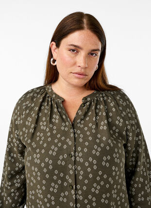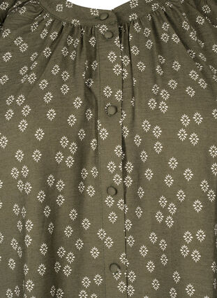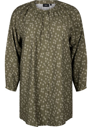 Kukkakuvioinen tunika pyöreällä pääntiellä, pitkät hihat kapeilla kalvosimilla ja nappikiinnitys koko matkalta alas. Tämä tunika sisältää 92% LENZING™ ECOVERO™ Viscose -kuituja, jotka tukevat luonnollista pehmeyttä ja laskeutuvuutta.