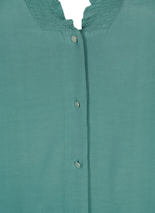 Pehmeä viskoosipaitapusero, jossa on nappikiinnitys edessä. Paitapuserossa on V-pääntie, jossa on smokatut reunat, sekä smokatut pitkät hihat ja helma. Paitapuserossa on laskokset olkapäillä, mikä antaa hihalle hienon vaikutelman. Tämä paitapusero sisältää 51 % LENZING™ ECOVERO™ viskoosikuituja, joiden ansiosta paitapusero on luonnollisen pehmeä ja kauniisti laskeutuva.</p