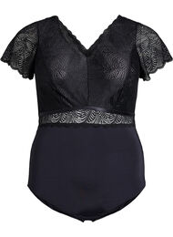 Elegantti bodysuit, jossa on lyhyet hihat ja V-pääntie. Yläosa on pehmeää pitsiä ja rinnan alla on joustava resori, joka antaa kevyttä tukea. Takana on osittain läpikuultava kangas ja siinä on pieni kultainen hakanen ja jousto, mikä tarjoaa lisää mukavuutta ja tukea. Alaosa on sileää, joustavaa mikrokuitua, jossa on shortsityylinen leikkaus, joka peittää koko alaosan. Bodysuit suljetaan alhaalta näppärillä neppareilla.