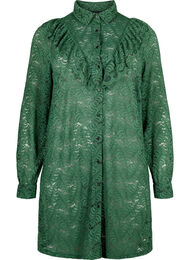Paitamekko naisellisella röyhelöllä ja klassisella paidankauluksella. Paitamekko on valmistettu kauniista ja laadukkaasta pitsistä ja siinä on nepparikiinnitys koko pituudelta.