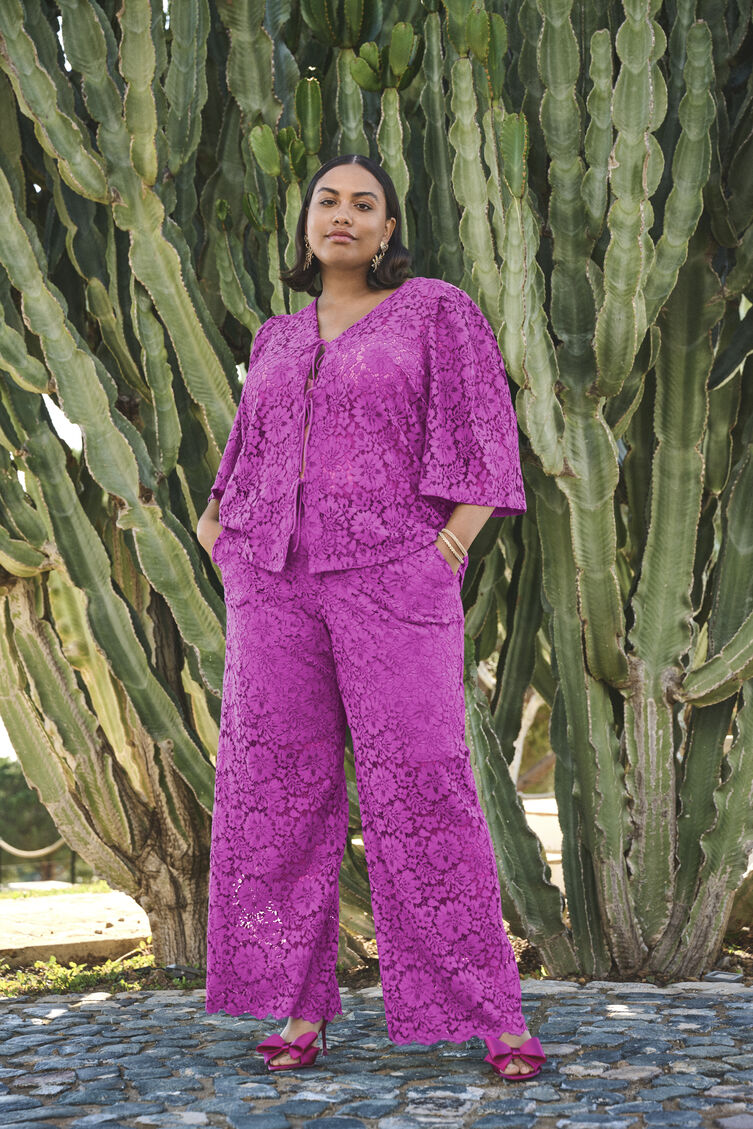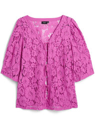 Naisten pitsipusero, jossa on kauniita kukkakuvioita. Kevyt ja elegantti design ilman vuorta. Puserossa on tavallinen istuvuus, rennot kolmivartiset hihat ja avoin etuosa kolmella hienovaraisella rusetilla koristekiinnittiminä.