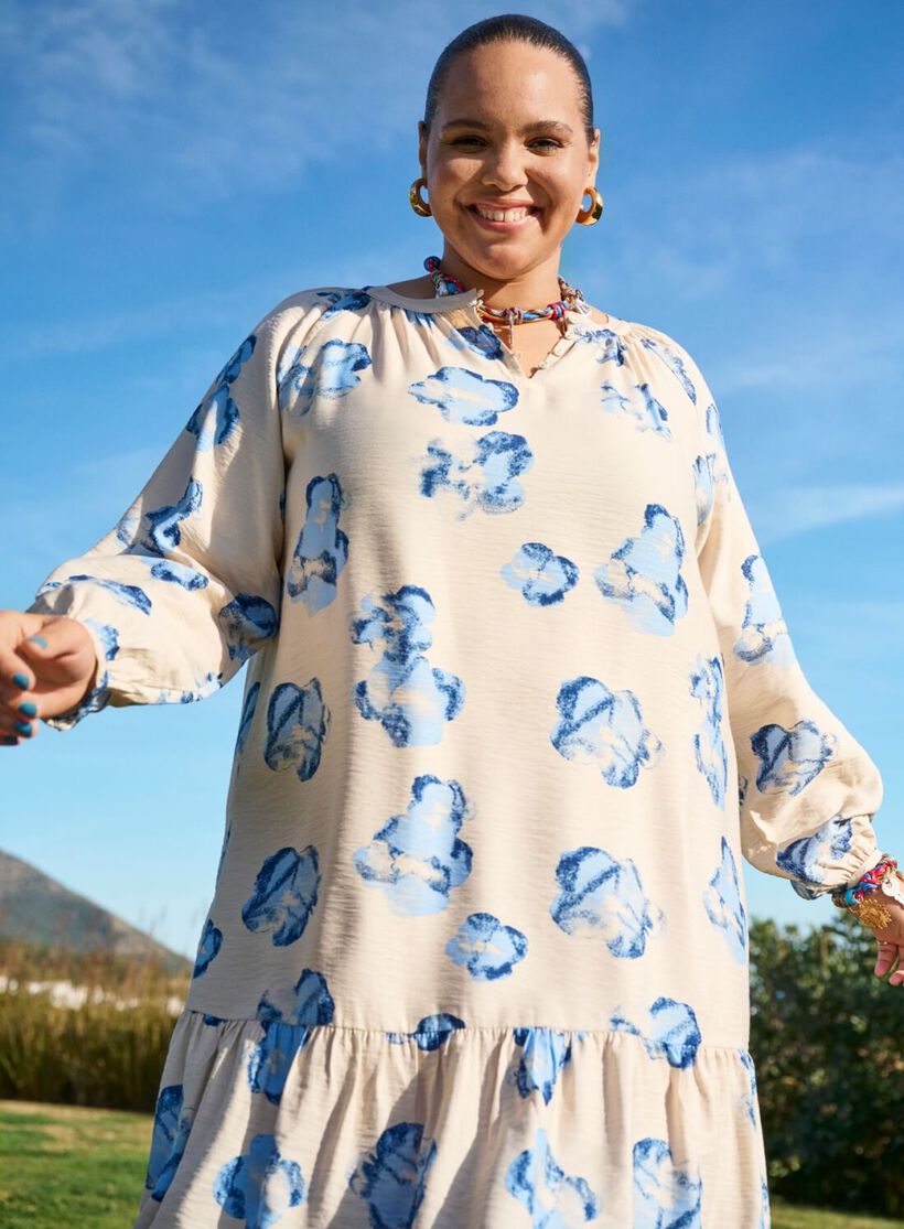 Polvipituinen mekko, jossa on kaunis kokoaluekuosi, pyöreä pääntie pienillä napeilla edessä ja pitkät raglanhihat kapeilla hihansuilla. Mekon helmassa on leikkaus, joka luo kauniin laskeutuvan A-linjan muodon. Tämä mekko sisältää 92% LENZING™ ECOVERO™ Viscose -kuituja, jotka tukevat luonnollista pehmeyttä ja laskeutumista.