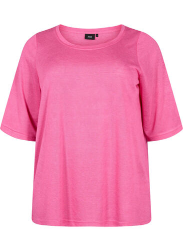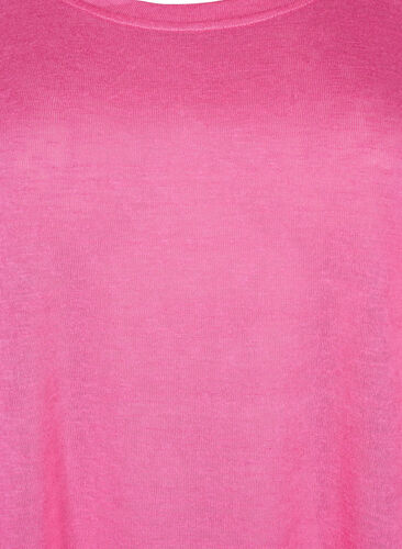 Yksivärinen pusero meleeratulla designilla normaalissa mallissa. Puserossa on pyöreä pääntie ja 3/4-hihat.