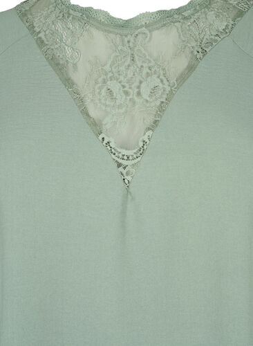 Lyhythihainen pusero, jossa pyöreä pääntie kiinnityksellä niskassa. Naisellinen pitsiyksityiskohta edessä ja selässä. Valmistettu kevuestä materiaalista, jossa on 51% kierrätettyä polyesteriä.