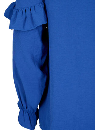 Naisellinen yksivärinen pusero, jossa on pitkät hihat ja röyhelökaulus. Puserossa on kangasnapit edessä ja kauniita röyhelöitä, jotka luovat naisellisen ilmeen.