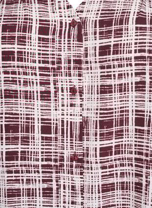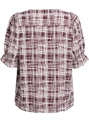 V-pääntiellä varustettu paitapusero, jossa on puolipitkät hihat joustavalla ja röyhelöreunalla sekä hienot smokkikoristeet olkapäillä. Puserossa on normaali istuvuus kokonaisella nappilistan kiinnityksellä, ja se on valmistettu kevyestä materiaalista, joka sisältää 55 % kierrätettyä polyesteriä.