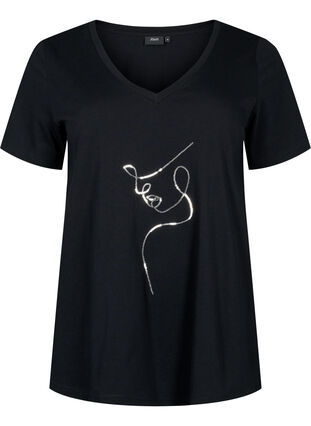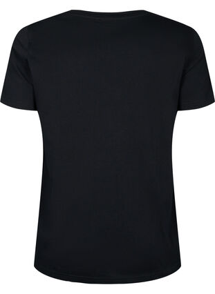 Naisellinen t-paita, jonka etupuolella on koristeellisia paljetteja. T-paidassa on lyhyet hihat, v-pääntie ja se on valmistettu pehmeästä puuvillasta, jossa on käytetty 50 % luomupuuvillaa.
