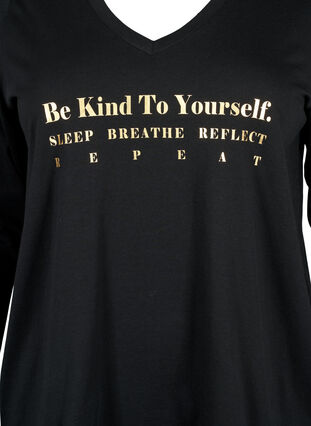 Pitkähihainen yöpaita 100 % puuvillaa, v-pääntie ja tekstipainatus rinnassa.