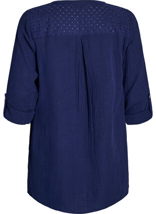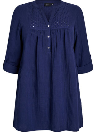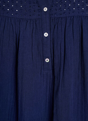 Pehmeästä musliinista valmistettu tunika, jossa 100% puuvillaa ja naisellinen broderie anglaise -yksityiskohta yläosassa. Designissa on pyöreä pääntie V-aukolla ja napeilla, ja mukava istuvuus. Pitkiä hihoja voi kääräistä ja stailata 3/4-pituuteen.