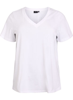 Perus-T-paita 100-prosenttista puuvillaa normaalilla lestillä. T-paidassa on ajaton, klassinen malli, lyhyet hihat ja V-pääntie.