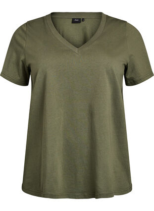 Perus-T-paita 100-prosenttista puuvillaa normaalilla lestillä. T-paidassa on ajaton, klassinen malli, lyhyet hihat ja V-pääntie.