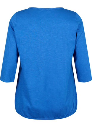 Yksivärinen pusero 100% puuvillasta, jossa on 3/4-hihat ja pyöreä pääntie sekä pitsireunus ja laskostus.