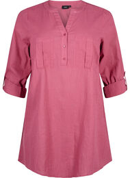 Yksinkertainen ja mukava puuvillatunika. Normaali istuvuus, nappikiinnitys edessä, rintataskut ja ¾-mittaiset hihat, joissa on ylös kääntyvät hihansuut.
