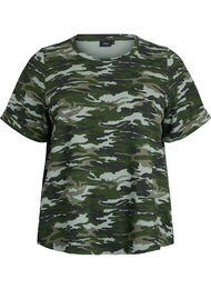 T-paita, jossa on pyöreä pääntie ja lyhyet hihat, joissa pieni kiinteä käänne. Regular fit -mitoitus. T-paita on valmistettu joustavasta puuvillakankaasta ja saatavilla leopardikuosina ja maastokuosina.