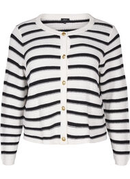 Tyylikäs raidallinen neuletakki, jossa on kultaiset napit ja normaali istuvuus. Neuletakissa on pitkät hihat, pyöreä pääntie ja se on valmistettu pehmeästä sekoitekankaasta.