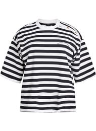 Raidallinen pusero, joka on valmistettu pehmeästä trikookankaasta ja jonka istuvuus on väljä ja mukava. Puserossa on koristeelliset kullanväriset napit toisella olkapäällä, 3/4-pituiset hihat, joissa on hieman levenevät hihat, ja pyöreä pääntie.