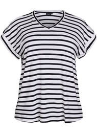 Raidallinen T-paita pehmeästä ja joustavasta trikoosta, jossa on rento ja väljä istuvuus. T-paidassa on V-pääntie, lyhyet hihat yksityiskohtaisilla reunoilla ja hieman laskettu olkasauma, joka vahvistaa rentoa tyyliä.