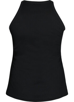 Tyköistuva toppi ribatusta puuvillasta. Siinä on pyöreä pääntie ja kapea yläosa.