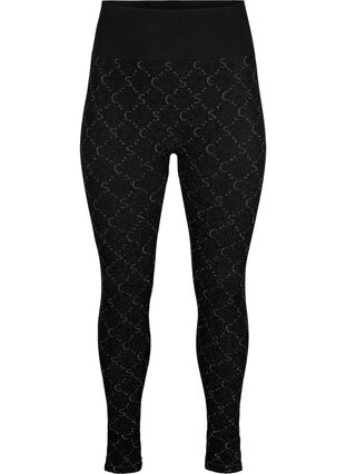Hyvin istuvat leggingsit kauniilla hopeisella glitter-kuviolla. Nämä leggingsit ovat saumattomat, mikä takaa mukavuuden ilman häiritseviä ompeleita ja saumoja.