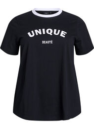 T-paita, jossa on tekstipainatus ja kontrastireunus
