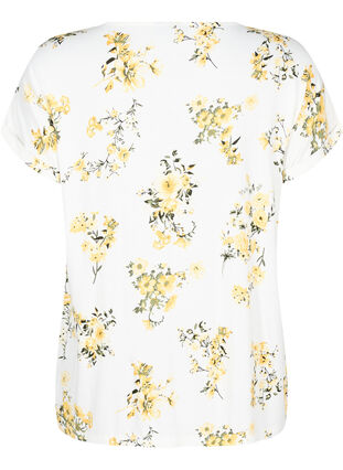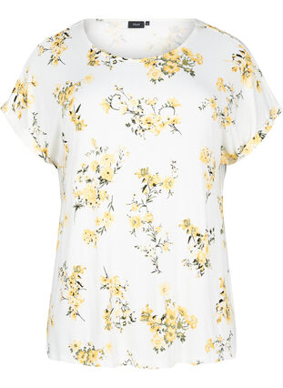 Pehmeää viskoosikangasta oleva T-paita naisellisella kukkaprintillä. T-paidassa on lyhyet hihat pienellä käänteellä, pyöreä pääntie ja normaali istuvuus.