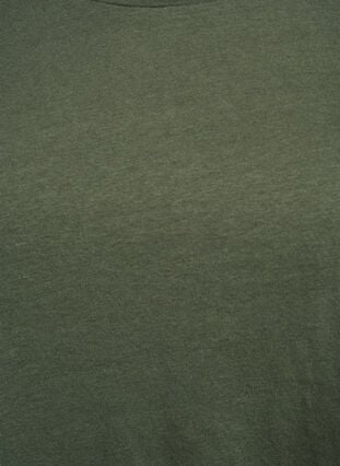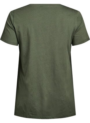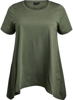 T-paita on 100% puuvillaa, ja siinä on pyöreä kaula-aukko sekä lyhyet hihat. Paidassa on rento ja imarteleva A-linjainen leikkaus lievästi epäsymmetrisellä helmalla, jossa sivut ovat pidemmät.