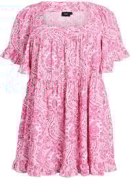 100 % viskoosista valmistettu naisellinen tunika, jossa on koristeellinen paisley-kuvio. Tunikassa on lyhyet ja väljät röyhelöreunaiset hihat, neliskulmainen pääntie jossa on röyhelöitä, ja halkio vyötäröllä. Hame on hieman levenevä ja viimeistelty röyhelöisellä helmalla, joka takaa mukavan A-muotoisen istuvuuden ja naisellisen tyylin.