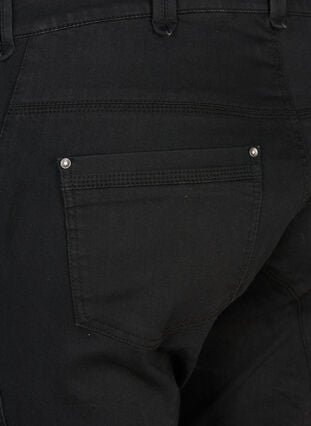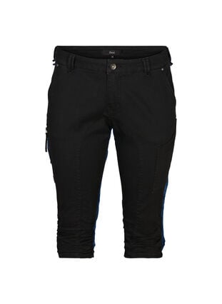 Tyköistuvat 3/4-pituiset caprifarkut, joissa on koristetaskut lahkeissa ja röyhelöyksityiskohdat lahkeissa. Näissä caprifarkuissa on normaali vyötärön korkeus, ja ne on valmistettu joustavasta puuvillasekoitteesta.