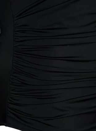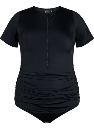 Lyhythihainen uimapuku, jossa on vetoketju ja drapeeraus edessä. Tässä uimapuvussa on rinnan alla sisäpuolinen kuminauha ja edessä verkkovuori, joka antaa lisätukea ja takaa miellyttävän istuvuuden. Uimapuku on valmistettu kestävästä ja kloorinkestävästä materiaalista, joka takaa pitkäaikaisen kestävyyden ja värinkestävyyden.