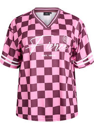 Urheilullinen T-paita ruutukuvioilla ja tekstiprintillä