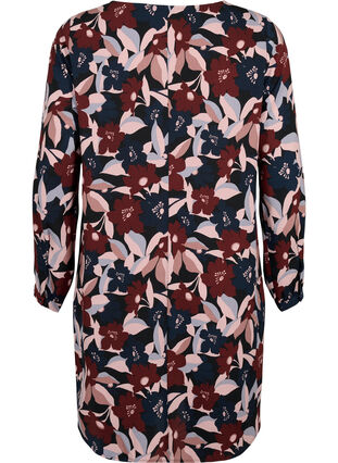 Mukava mekko kauniilla kokopainatuksella, valmistettu 55 % kierrätetystä polyesteristä. Mekossa on pitkät hihat nappikiinnityksellä, V-pääntie ja pyöristetty reuna helmassa.