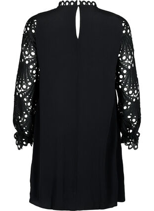 Mekko, jonka materiaali on 100 % viskoosia, ja jossa on kauniit pitkät virkatut hihat. Mekossa on koristeellinen pääntie, keyhole-napitus niskassa ja mukavan väljä A-linjainen leikkaus.