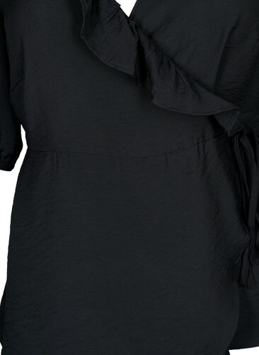 Erittäin ihana kietaisupusero, joka on valmistettu kevyestä viskoosilaadusta, ja jossa on joustavuutta ja rakennetta. Puserossa on 1/2 pituiset hihat, joissa on joustava reuna, joka luo kevyen pallomaisen efektin, ja v-pääntie, jossa on naisellinen röyhelöreuna.