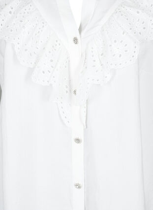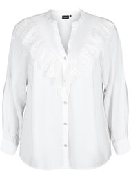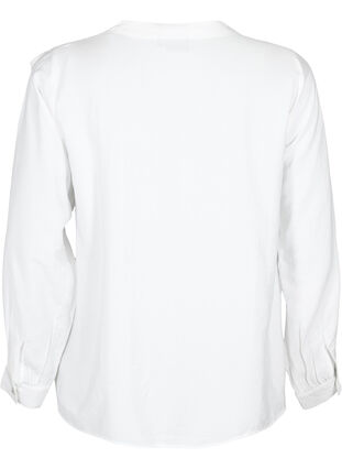 Paitapusero joustavaa ja miellyttävää viskoosia. Naisellinen röyhelöyksityiskohta edessä. Paitapusero suljetaan koristenapeilla, ja siinä on pyöreä pääntie V-mallisella somisteella.
