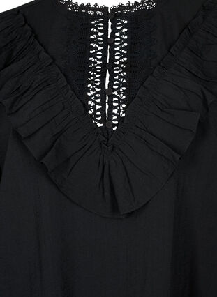 Viskoosista valmistettu pusero röyhelöillä ja kirjontayksityiskohdilla