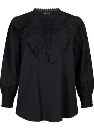 Naisellinen pitkähihainen pusero, jossa on smokatut ja röyhelöiset hihat sekä kaunis kirjonta- ja röyhelöyksityiskohta edessä. Tämä pusero sisältää 80 % LENZING™ ECOVERO™ -viskoosikuituja, joiden ansiosta pusero on luonnollisen pehmeä ja kauniisti laskeutuva.