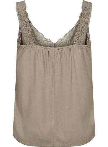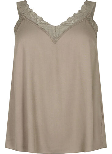 Naisellinen viskoositoppi normaalilla istuvuudella Topissa on kauniit pitsikoristeet sekä olkaimissa että kaula-aukon etupuolella.