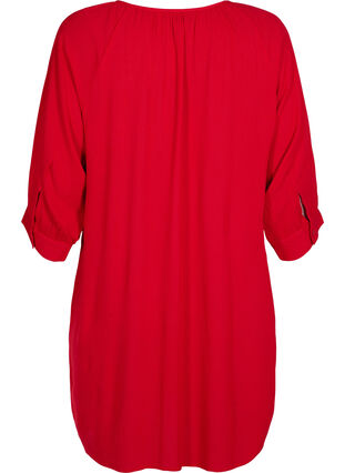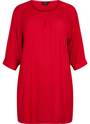 Yksivärinen tunika 3/4-hiholla. Valmistettu pehmeästä 100 % LENZING™ ECOVERO™ -viskoosista. Tunikassa on pyöreä pääntie ja napit. A-mallinen tunika laskeutuu kauniisti.