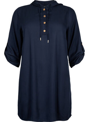 100% viskoosista valmistettu tunika hupulla ja säädettävillä nyöreillä. Siinä on pitkät hihat käärimismahdollisuudella ja koristeelliset napit edessä. Laskostus takana tekee siitä kevyesti laskeutuvan.