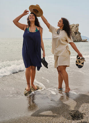 Midi-mekko, jossa on kapeat säädettävät olkaimet ja pieni laskostus edessä pääntiessä, joka tuo kauniin poimutuksen mekon väljään A-linjaiseen malliin. Tämä mekko sisältää 100 % LENZING™ ECOVERO™ -viskoosikuituja, jotka tukevat luonnollista pehmeyttä ja laskeutuvuutta.