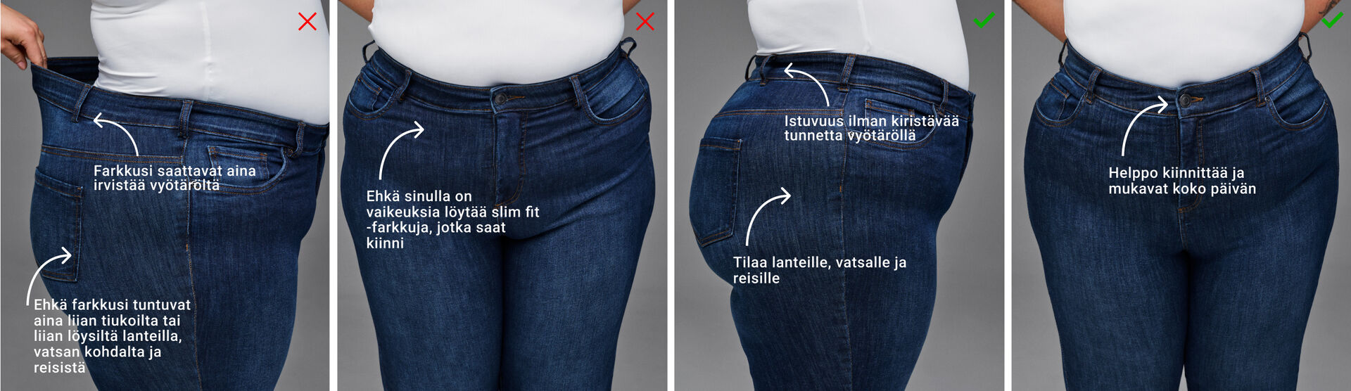 Tuntuuko siltä, että farkkusi eivät koskaan istu kunnolla? Ehkä ne irvistävät vyötäröltä, ovat liian tiukat tai liian löysät lanteilla, vatsan kohdalta tai reisistä – tai sinulla on vaikeuksia löytää slim fit -farkkuja, jotka saat oikeasti kiinni.